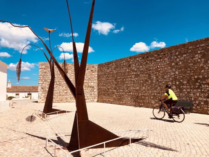 We decided to head out of town up to the castle on the hill at Castro Marim, but unfortunately I got a puncture halfway there. No puncture repair kit and we had left the pump back at the hotel. No option but to walk back to town and find a bike shop. Easier said than done it would seem. Google wasn’t very helpful as a search showed the nearest bike shop was over the border in Spain about 20ks away. We asked a local on a bike and he gave us some directions to one in town, that turned out not to exist any more if it ever did. Ali cycled every street to see if she could find one, but no luck. I walked back to the hardware shop as the young guy in there spoke pretty good English to see if he knew of one. By this time it was getting quite late so we were thinking we might be out of luck. The guy in the hardware shop gave me directions to where he thought there was one, but that was also fruitless. I was about to give up when by chance I walked past what looked like a open garage door with a load of bikes inside. Turned out to be the town bike shop! No sign, no shopfront, just a load of bikes and an old lady who spoke zero English. With a bit of sign language and a mix of a few words of French, Spanish and Portuguese she explained that she couldn’t help me but knew a man who could. I tried to explain that I just needed a spanner, pump, patch and glue and I could help myself. She had none of the above (or probably didn’t know where to look). Anyway, armed with instructions to head toward the roundabout near the supermarket, turn right and look for the third door on the right off I went again. And there was my saviour fixing someone else’s bike just where the old lady said he would be. He spoke no English and I speak no Portuguese (other than hello, can I have a beer/coffee please and thank you), but a flat tire is pretty self explanatory and he had enough fingers on one hand to tell me how many Euros a new tube was going to cost me (the hole was too big and in a bad place for patching).