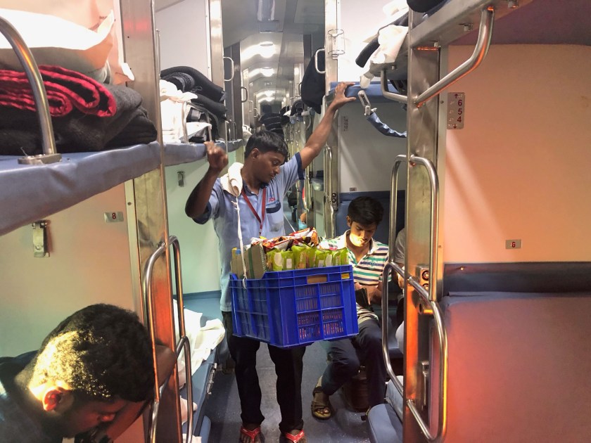 It’s early morning on the Kerala Express and the train is just starting to come to life. I can hear people around me stirring from their bunks and the chaiwala has already been past twice softly calling ‘chai, chai,’. Later in the day this will become a shout, along with the shouts from all the food sellers walking the train.