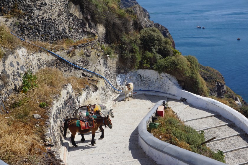 Alright, my last rant on Santorini and then I will move on to more tranquil and peaceful things. The Donkeys, poor things. We walked to the bottom of the cliff at Thira where the cruise ship passengers disembark (no cruise ships there that day), down the steps, all 588 of them. It was a relatively quiet day, but there were still a few donkeys walking up carrying tourists back up to town but I couldn’t help noticing there was no water for the donkeys and one in particular looked a bit distressed. So I couldn’t help doing a little bit of googling to find out more about them. Turns out that animal rights activists are up in arms about the way the donkeys are treated. They are made to do the trek up and down 6-7 times a day with someone on their back and apparently it has got so bad now that even some of the cruise ships are encouraging their passengers not to use the donkeys. There is a cable car, same price, or you can walk, but it is a tough climb.