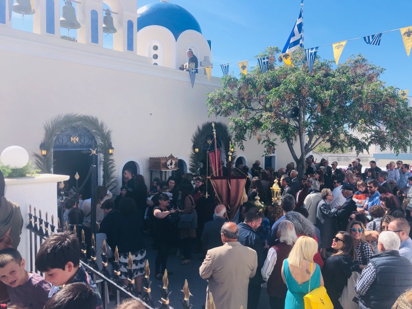 And one of my favourite moments of the whole trip happened on Santorini. Ali likes to remind me of that but I contend that this could have happened in any Greek village anywhere. Let me explain. It is possible to escape the crowds, souvenir shops, overpriced restaurants, traffic, mistreated donkeys etc. on Santorini if you rent a scooter and seek out a few of the small villages where some semblance of traditional Greek life actually still goes on. Well, whilst in one of these villages on a Sunday morning we found the locals at church, with a marching band waiting outside. We wandered up to the top of the hill where another whitewashed blue domed church stood that you could actually stand on top of, which we did, on our own. And then the church bells of the other two churches in the village started up (there are more churches than you can poke a stick at, and blue domes abound). We stood there, no tourists, no selfie sticks, it was beautiful. When the bells stopped and we came down the locals were all outside their church sharing food and drinking wine. Beautiful.
