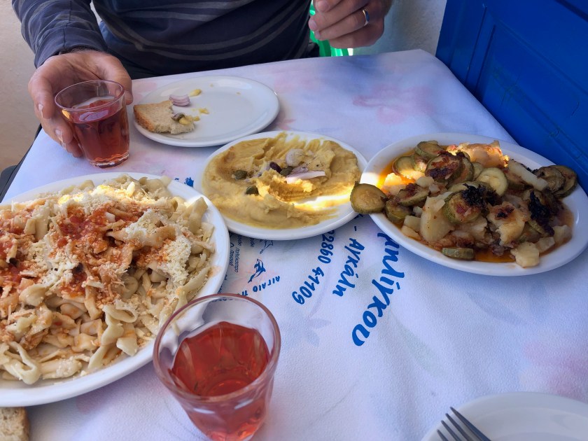 Folegandros also has some great walking trails, nice secluded beaches and the best Greek dining experience we have had so far. Whilst out exploring on a rented scooter one day we came across Irene’s restaurant. It was actually more like Irene’s front room with a few tables and chairs. It’s is run by Irene, who does the cooking, and her granddaughter Irene who serves the customers. Folegandros is famous for its matsata, which is basically a kind of hand made pasta, so we thought we had better try it. I went for the braised lamb in tomato sauce and Ali had the pork in lemon sauce. It was real rustic home cooked Greek food, all washed down with half a litre of locally made wine. Dessert was complementary and delicious and it was such a great experience that we went back the next day for lunch to try a few different dishes which were equally as good.