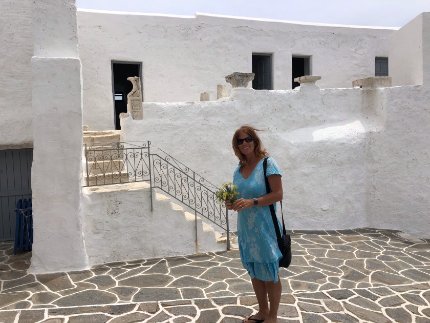 One of my favourite experiences on Paros was riding our little rented scooter to the monastery on top of the hill where we were greeted by a lovely lady who spoke no English but her hospitality was fantastic. We were given a glass of mead and some loukoumi which is basically Greek Turkish delight. We were allowed to look inside the church and also into the monks cells in the monastery and as we left Ali was given a posy of freshly picked flowers.