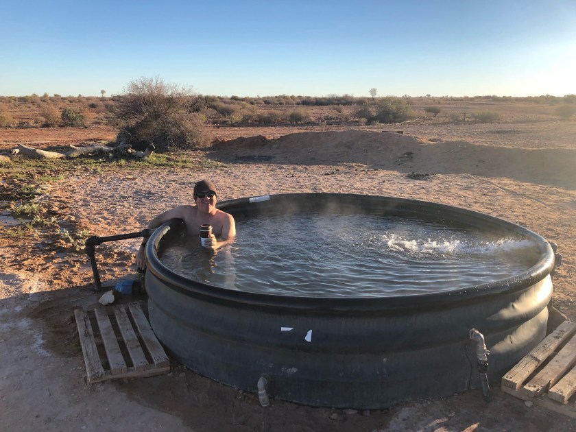 The Birdsville track isn’t quite the challenge that it used to be, but it does still do its best to destroy windscreens, tyres and caravans whenever possible. Fifty years or so ago it still took almost a couple of weeks to drive from Marree to Birdsville but these days you can drive it in a day or two. We weren’t in a rush so we did it with a couple of overnight camps along the way, and the only damage sustained was a stone smashing a pipe coming out of the water tank under the van. Didn’t notice it until we set up camp and found we had no water! Nothing a bit of glue and tape couldn’t fix though and fortunately we camped at a place that had water to refill the tank with. In fact one of our stops was by a bore where water from the Great Artesian Basin comes out hot enough for a nice relaxing spa in the thoughtfully provided plastic pool, and afterwards for a hot shower in the equally thoughtfully provided tin shed.