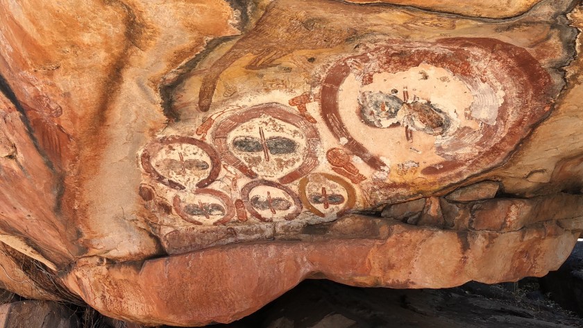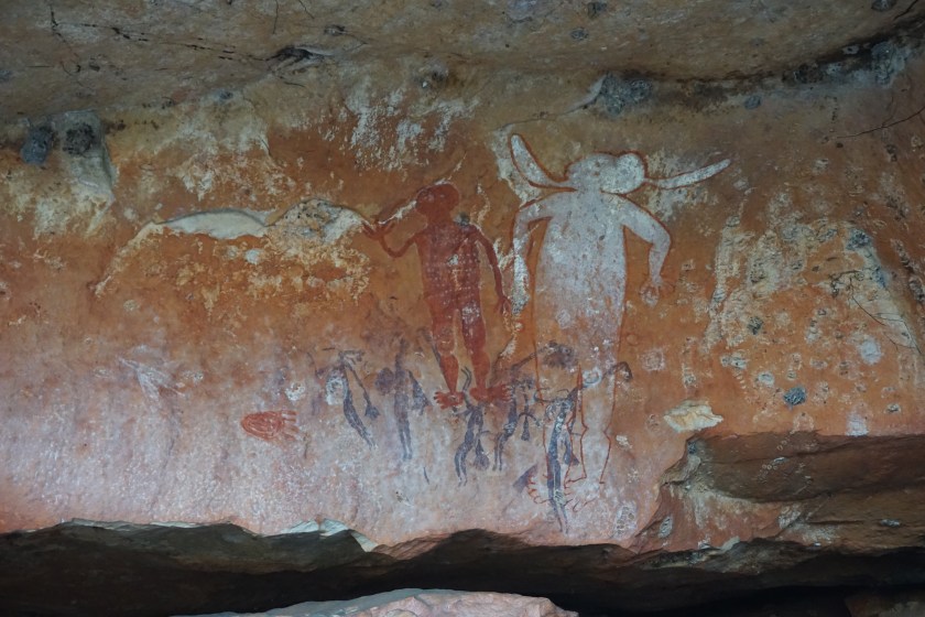 One of the most interesting paintings that seems to appear all over the Kimberly is the Wandjina. These spirit beings started appearing around 4,000 years ago and were apparently repainted over the top of the original every decade or so. The Wandjina are painted with a round white face, big round eyes, what appears to be a halo or helmet of some kind and a nose but no mouth. The story that goes with them is that they came down from the sky and shaped the land and the rivers and looked after the people. Apparently they realised this was a pretty big job so they sent for reinforcements and more of them arrived later. When they left, some went back into the sky and some went into the earth and live at the source of natural springs.