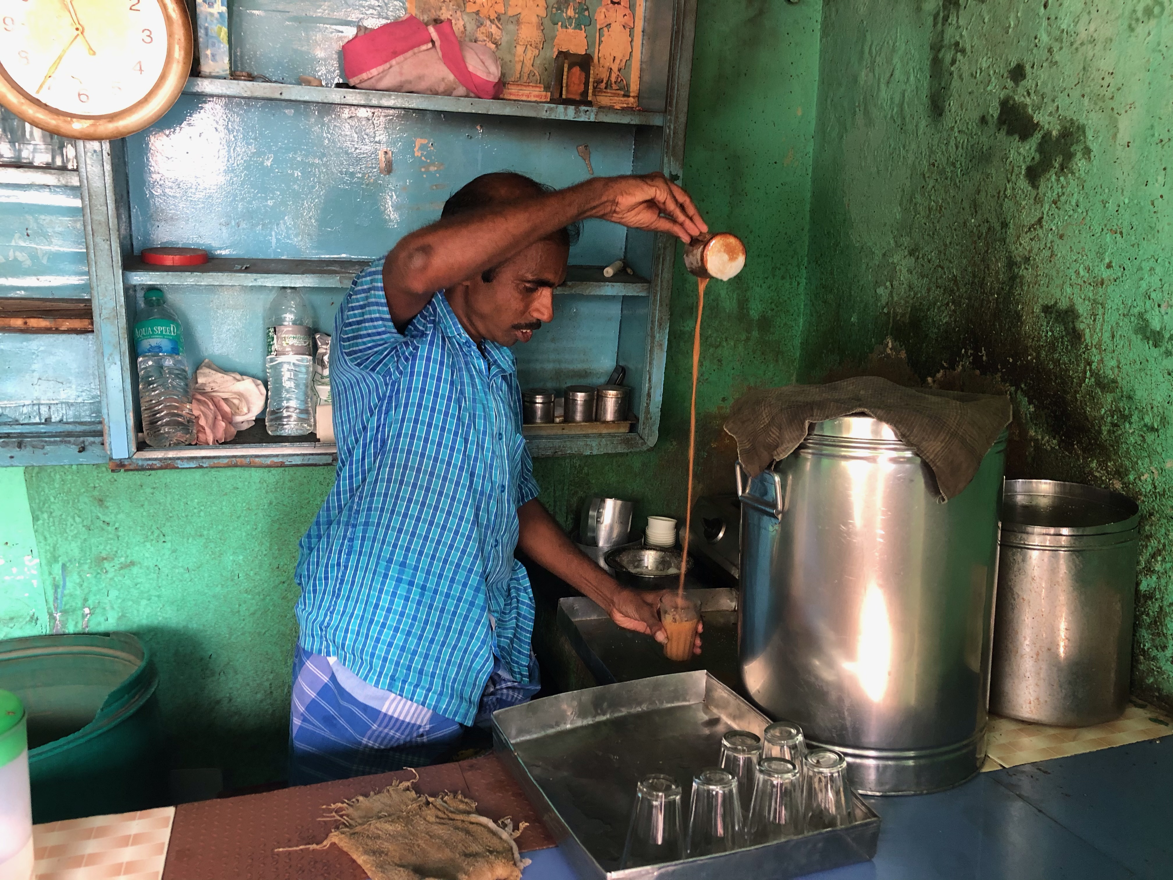 I think I will stop him on his next pass for a cup. I’m not a tea drinker at home but chai here in India is delicious. Steaming hot, sweet and fragrant. I love the way they do it on the street corners. The steaming hot milk gets ladled into a jug, a bit of the boiling spiced tea is added, sugar is added to the glass and then the mixture is poured from jug to glass, glass to jug a few times in a very flamboyant way to mix everything up and take a bit of the heat out so that you can hold it. A bit of showmanship and a nice hot cup of chai all for the equivalent of about $0.20.