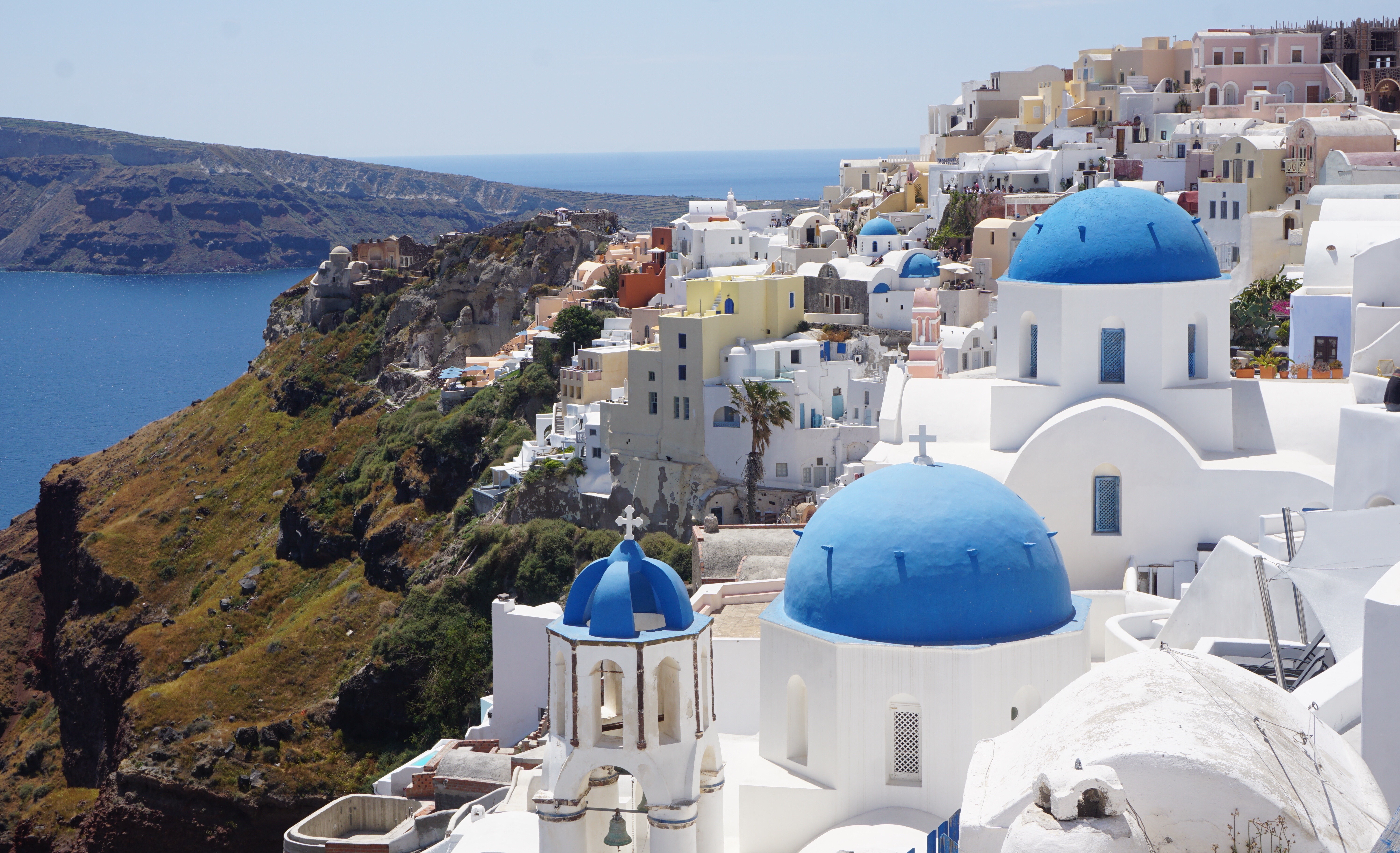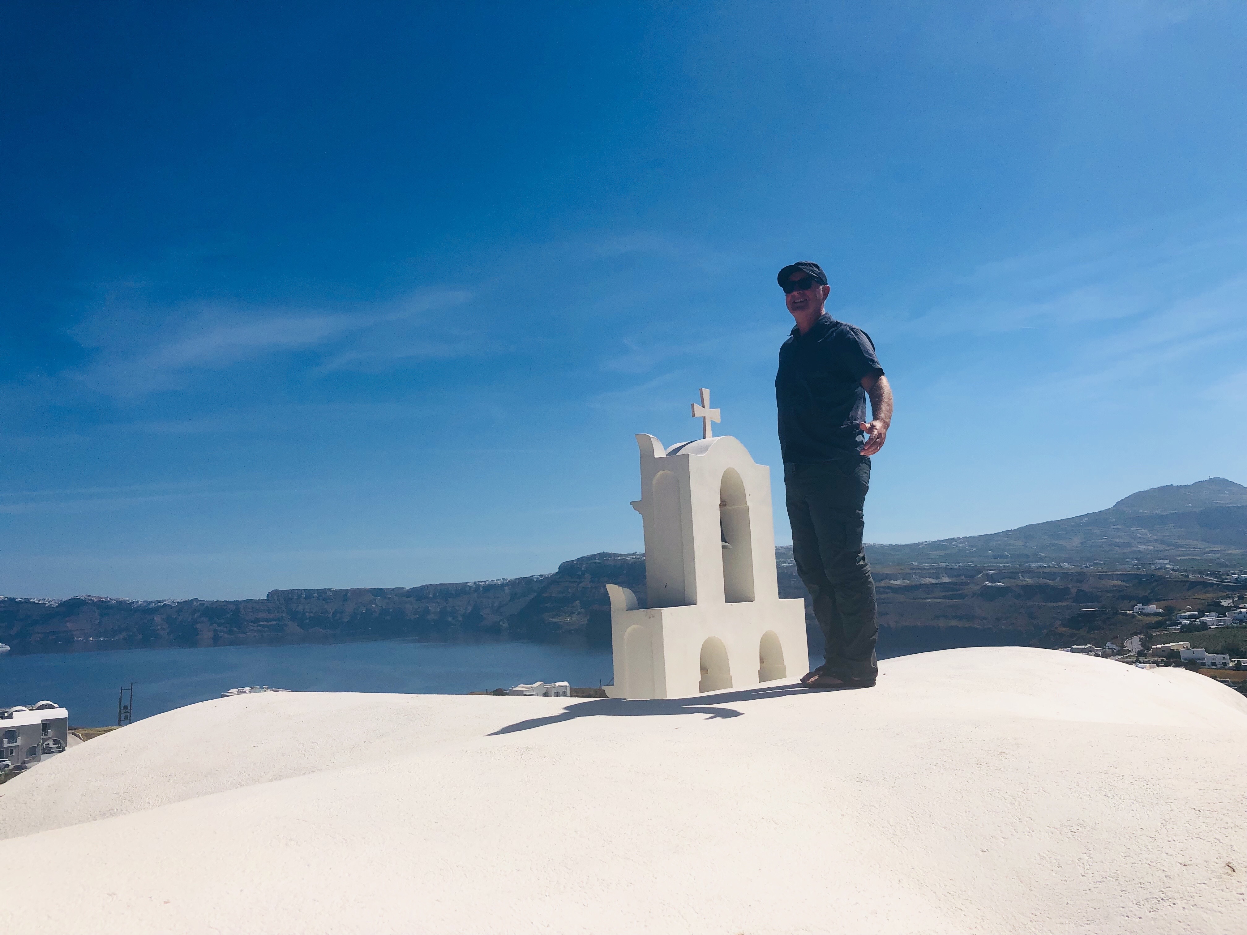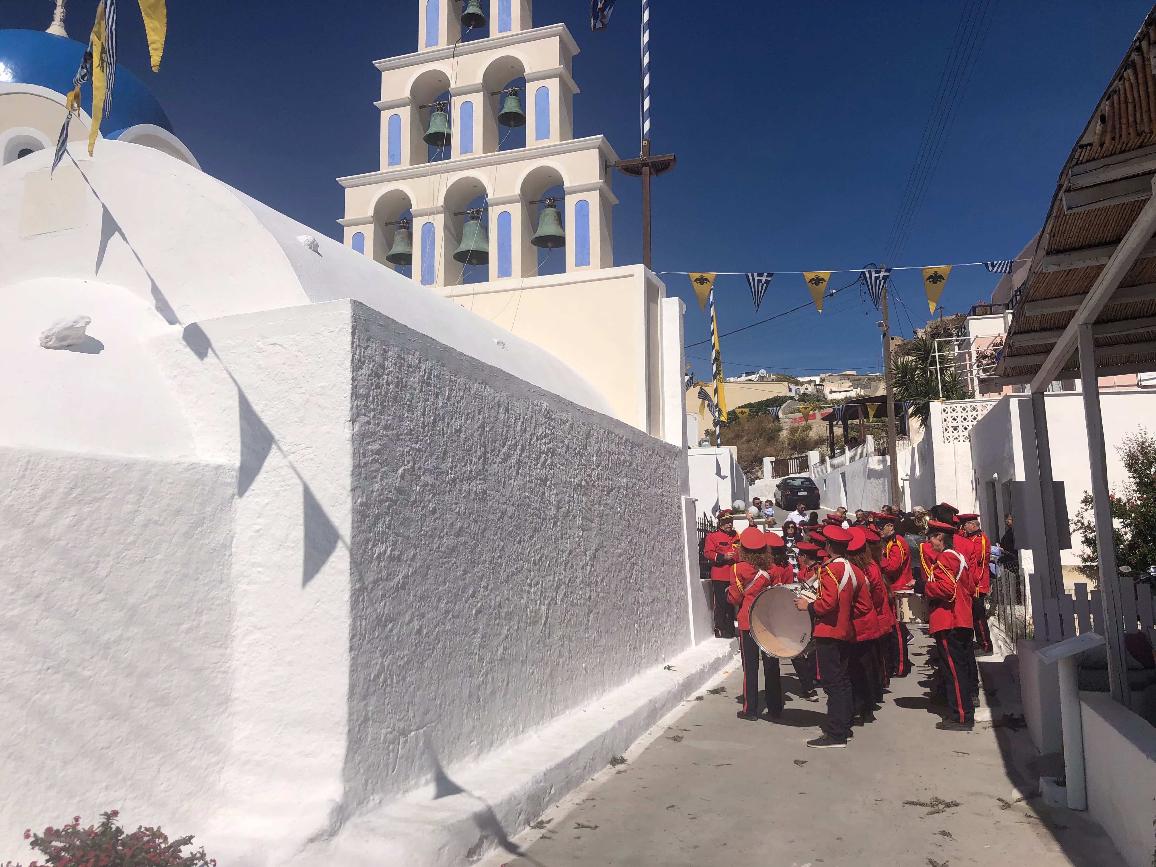And one of my favourite moments of the whole trip happened on Santorini. Ali likes to remind me of that but I contend that this could have happened in any Greek village anywhere. Let me explain. It is possible to escape the crowds, souvenir shops, overpriced restaurants, traffic, mistreated donkeys etc. on Santorini if you rent a scooter and seek out a few of the small villages where some semblance of traditional Greek life actually still goes on. Well, whilst in one of these villages on a Sunday morning we found the locals at church, with a marching band waiting outside. We wandered up to the top of the hill where another whitewashed blue domed church stood that you could actually stand on top of, which we did, on our own. And then the church bells of the other two churches in the village started up (there are more churches than you can poke a stick at, and blue domes abound). We stood there, no tourists, no selfie sticks, it was beautiful. When the bells stopped and we came down the locals were all outside their church sharing food and drinking wine. Beautiful.